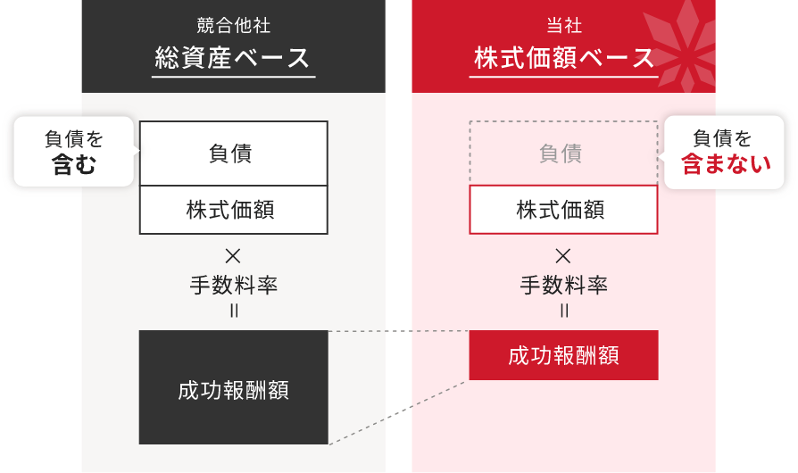 他社では、着手金、中間金、月額報酬などの名目で、成功していないケースでも一定の報酬が発生します。当社では成功し、売買金額が入金されるまで一切報酬がいらない完全成功報酬ですので安心して多数の経営者様にご利用いただいております。